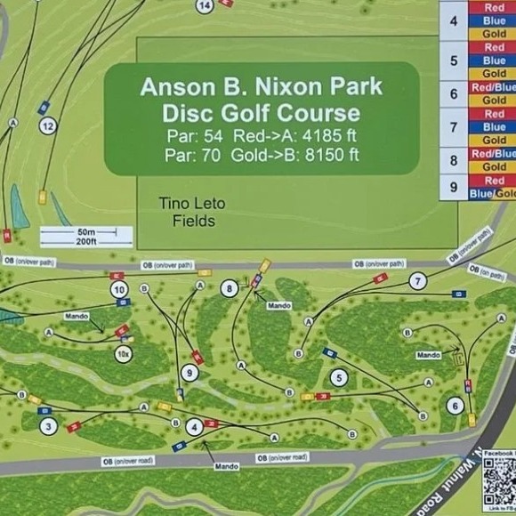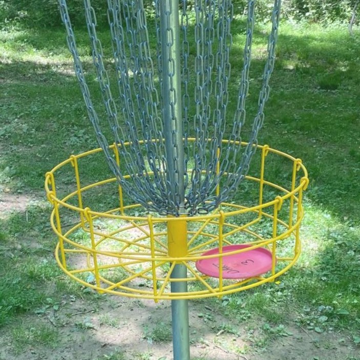 Installed in 1996; the course includes a mix of open and wooded holes with elevation changes throughout. There are 19 holes with 37 baskets and 47 tee pads, providing options for all skill levels. 18 Dynamic Disc Veteran baskets, 19 DGA Mach baskets, 47 tee pads with/ color-coded tee signs, and 64 color-coded "next tee" arrows.
