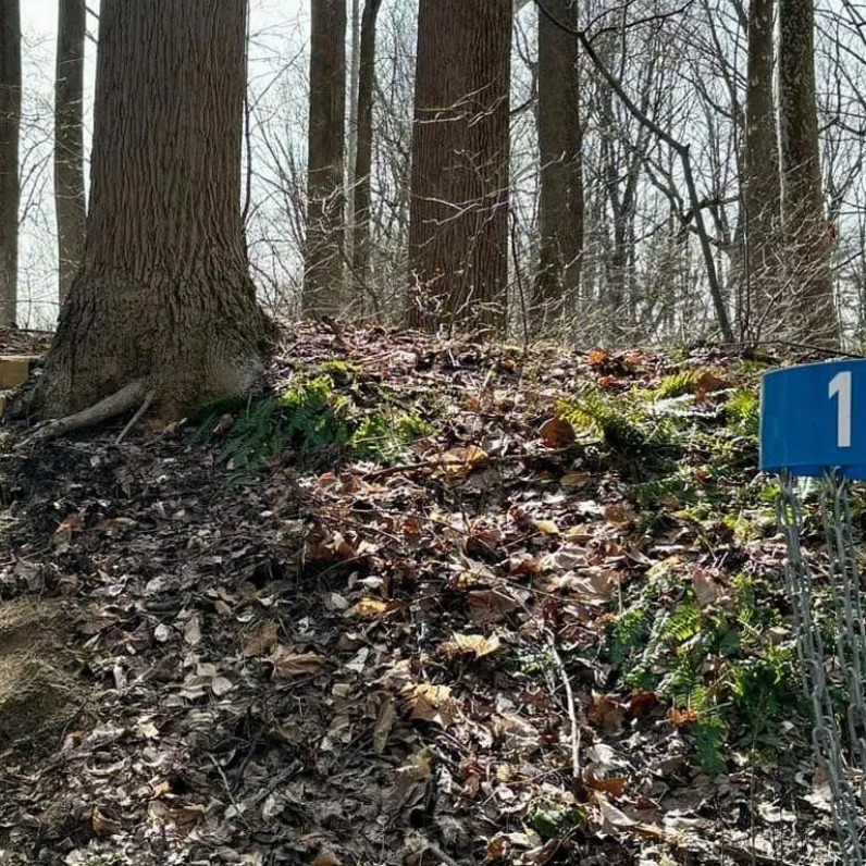 The 9-hole disc golf course at Mt Bradford Preserve utilizes only a portion of the property, but incorporates significant elevation changes as well as a mixture of open and wooded holes, as well as streams. The gravel parking lot at the park entrance lies adjacent to a practice tee as well as hole #1 fairway and hole #9A Basket.